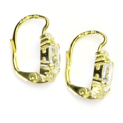 Náušnice ze žlutého zlata s čirými zirkony. Materiál je zlato 585/1000. Orientační váha náušnic je 3,52 g. Celková výška náušnice je 17 mm. Náušnice mají zapínání na klapku. Použité čiré zirkony:8 x 6 mm 2 ks a zirkon :1,5 mm 12 ks.