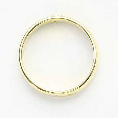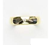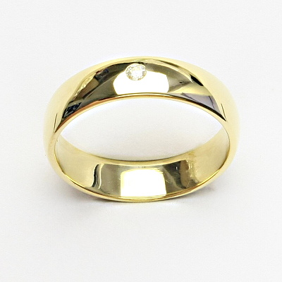 Zlatý prstýnek - hladký kroužek s čirým zirkonem. Prstýnek je vhodný i jako snubní prsten. Materiál je žluté zlato 585/1000. Šířka prstenu je 5 mm. Orientační hmotnost při velikosti 54 je 4,20 g.
