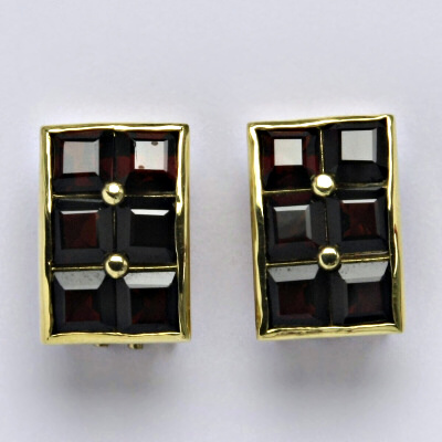 Zlaté náušnice zdobené přírodním granátem. Materiál je žluté zlato 14 karátů 585/1000. Celková velikost náušnice je 16 mm. Zapínání na náušnicích je pasivní patent. Do sady lze dokoupit zlatý přívěsek a prsten s přírodním granátem.