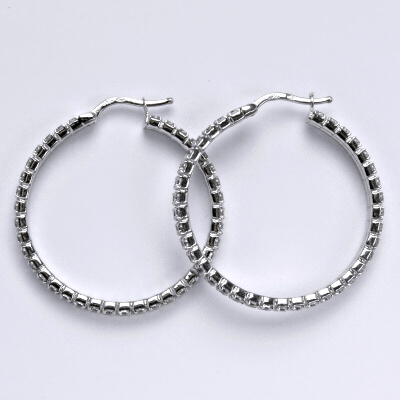 Zlaté náušnice z bílého zlata kruhy s čirými zirkony. Průměr kruhů 31 mm. Zapínání náušnice je na patent. Váha náušnic je 8,06 g. Materiál je 14 karátové zlato 585/1000.