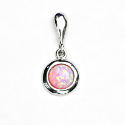 Přívěsek z bílého zlata je zdoben růžovým syntetickým opálem o průměru 6 mm. Materiál je zlato 585/1000. Orientační váha přívěsku je 1,05 g. Rozměr přívěsku je 20 mm včetně úchytu na výšku a 9 mm na šířku.