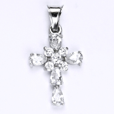 Přívěsek, křížek, vyrobený z bílého zlata 14 karátů 585/1000, zdobený syntetickým zirkonem. Celková velikost přívěsku včetně ouška je 27 mm. Při více kusech skladem je váha orientační.