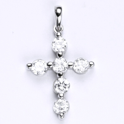 Přívěsek, křížek, vyrobený z bílého zlata 14 karátů 585/1000, zdobený syntetickým zirkonem. Celková velikost přívěsku včetně ouška je 26 mm. Při více kusech skladem je váha orientační.