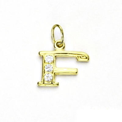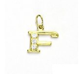 Zlatý přívěsek písmenko F je zdobeno čirými zirkony. Materiál je zlato 585/1000. Rozměr přívěsku je 16 mm včetně očka a 13 mm na šířku. Orientační váha přívěsku je 0,95 g.