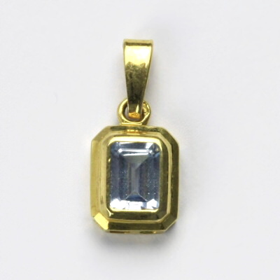 Přívěsek je vyrobený ze žlutého zlata o ryzosti 14 karátů 585/1000. Přívěšek je zdoben akvamarinem. Orientační váha přívěsku je 1,70 g. Celková výška přívěsku včetně očka je 20 mm.