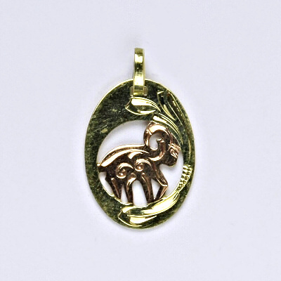 Přívěsek je vyrobený ze žlutého a červeného zlata 14 karátů 585/1000. Celková velikost přívěsku včetně ouška je 19 mm.