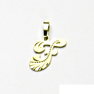 Přívěsek ve tvaru písmenka F ze žlutého zlata. Materiál je zlato 585/1000. Rozměr přívěsku je 17 mm včetně očka na výšku a 11 mm na šířku. Orientační váha přívěsku je 0,54 g