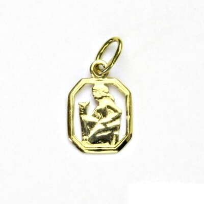 Přívěsek ze žlutého zlata - znamení zvěrokruhu panna. Materiál je zlato 585/1000. Rozměr přívěsku je 18 mm včetně očka na výšku a 10 mm na šířku. Orientační váha přívěsku je 0,69 g.