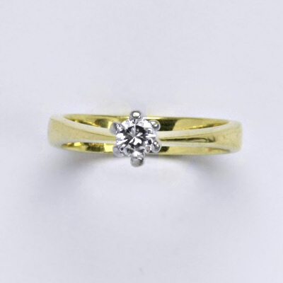 Prsten je vyrobený v kombinaci žluté a bílé zlato 14 karátů 585/1000, zdobený syntetickým zirkonem. Průměr kamene je 4 mm. Velikost prstenu je 51.