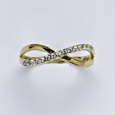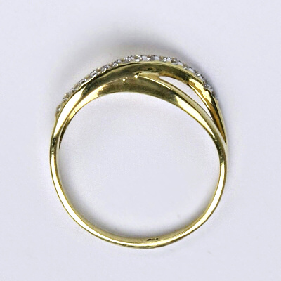 Prsten je vyrobený ze žlutého zlata, je zdobený syntetickými zirkony. Materiál je zlato 14 karátů 585/1000.
