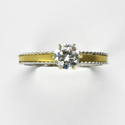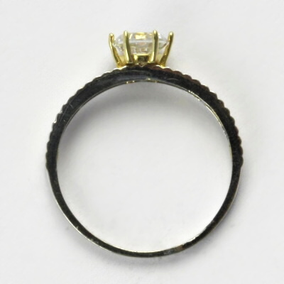 Prsten je vyrobený z kombinace žlutého a bílého zlata. Do zlata je zafasován bílý zirkon.. Materiál je zlato o ryzosti 14 karátů 585/1000. Orientační váha prstenu je 2 g. Prsten máme skladem ve velikosti 57. Průměr zirkonu je 6 mm.