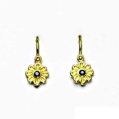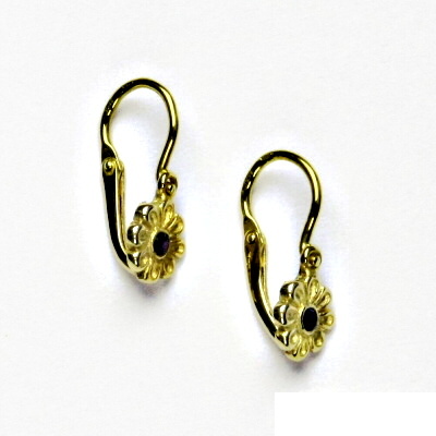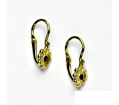 Dětské zlaté náušnice jsou zdobeny přírodním granátem a mají tvar kytičky. Materiál je zlato 585/1000. Rozměr kytičky je 6 mm. Celková výška náušnice je 14,5 mm. Náušnice mají zapínání na brizuru.