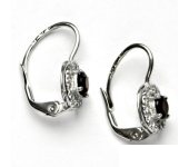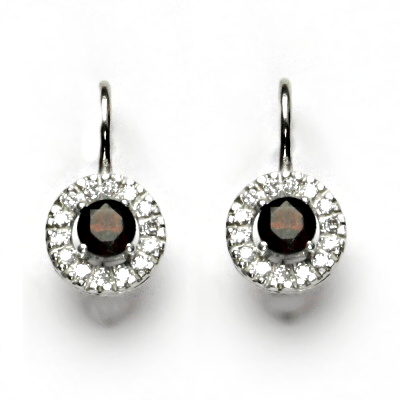 Dámské náušnice z bílého zlata jsou zdobeny čirými zirkony a přírodním granátem o průměru 4 mm. Materiál je zlato 585/1000. Náušnice mají zapínání na klapku a jsou rhodiované. Orientační váha je 2,54 g. Celková výška náušnice je 18 mm.