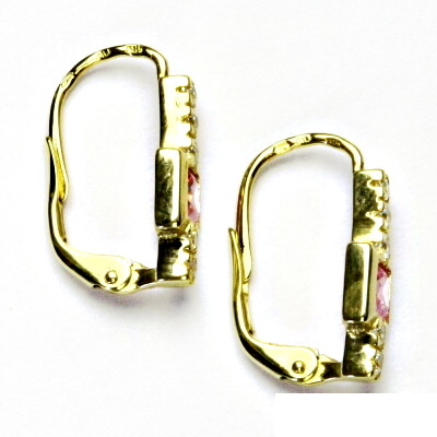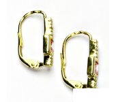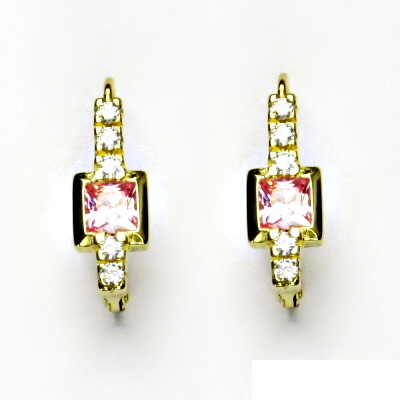 Dámské náušnice jsou vyrobeny ze žlutého zlata a jsou zdobeny růžovým zirkonem a čirými zirkony. Materiál náušnic je zlato 585/1000. Celková výška náušnice je 18 mm. Rozměr zdobné části je 15x6 mm. Náušnice mají zapínání na klapku.