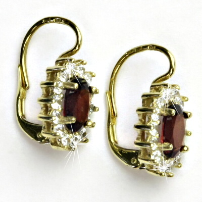 Náušnice ze žlutého zlata jsou zdobeny čirými zirkony a přírodním granátem 8x6 mm. Materiál náušnic je zlato 585/1000. Celková rozměr náušnice na výšku je 20 mm a 11,5 mm na šířku. Orientační váha náušnic je 3,9 g.