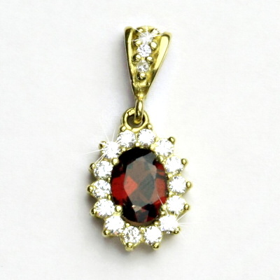Přívěsek ze žlutého zlata je zdoben čirými zirkony a přírodním granátem o rozměru 8x6 mm. Materiál je zlato 585/1000. Rozměr přívěsku je 24 mm včetně očka na výšku a 11 mm na šířku. Orientační váha přívěsku 2,10 g.