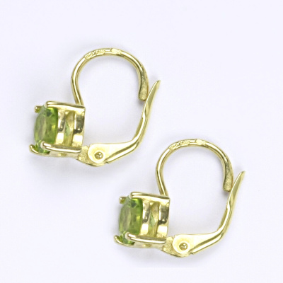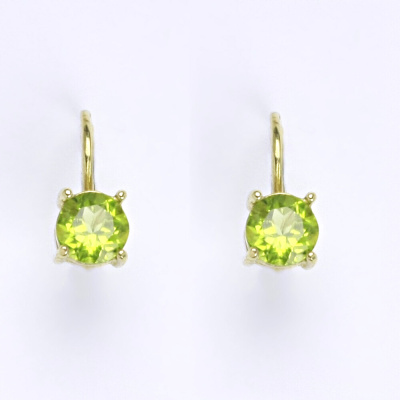 Zlaté náušnice ze žlutého zlata 14 karátů s přírodním olivínem. Velikost kamene je 6 mm. Náušnice mají zapínání na klasický patent. Celková výška náušnic je 15 mm. Orientační váha náušnic je 2,01 g.