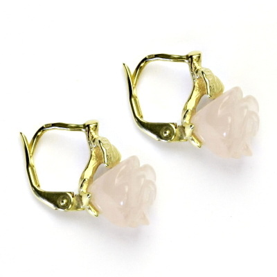 Náušnice ze žlutého zlata jsou zdobeny přírodním růženínem ve tvaru růžičky. Materiál náušnic je zlato 585/1000. Náušnice mají zapínání na patent. Průměr růžičky je cca 10 mm. Orientační váha náušnic je cca 3,96 g.