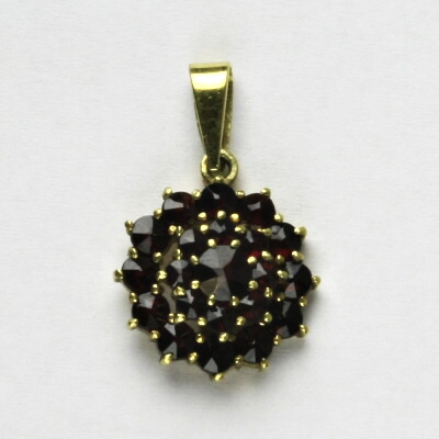 Přívěsek je vyroben ze žlutého zlata a je zdoben přírodními granáty o průměru 2, 3 a 4 mm. Materiál je zlato 585/1000. Rozměr přívěsku je 23,5 mm včetně úchytu na výšku a 15 mm na šířku. Orientační váha je 3,10 g.