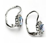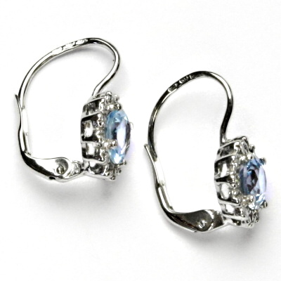 Dámské náušnice z bílého zlata jsou zdobeny malými čirými zirkony a přírodním topazem sky o průměru 6 mm. Materiál je zlato 585/1000. Náušnice mají zapínání na patent a jsou rhodiované. Orientační váha náušnic je 2,76 g. Celková výška náušnice je 17 mm