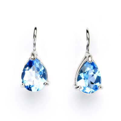 Náušnice z bílého zlata s přírodním topazem swiss ve tvaru slzy o rozměru 8x6 mm. Materiál je zlato 585/1000. Orientační váha náušnic je 3 g. Celková výška náušnice je 16 mm.