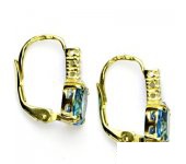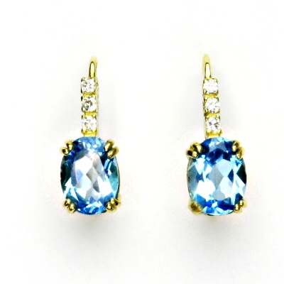 Náušnice ze žlutého zlata jsou zdobeny malými čirými zirkony a přírodním topazem swiss o rozměru 8x6 mm. Celková výška náušnice je 16 mm. Náušnice mají zapínání na klapku. Materiál je zlato 585/1000. Orientační váha je 2,6 g.