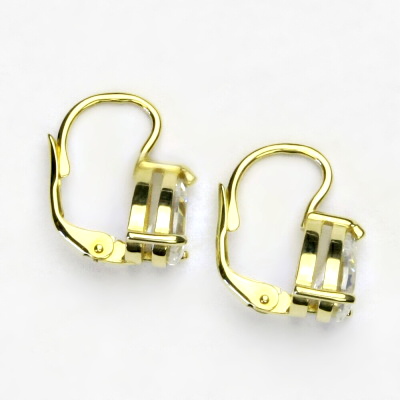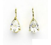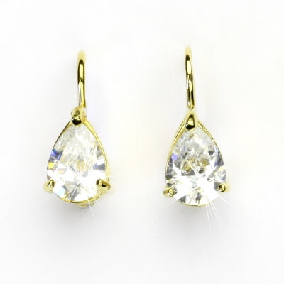Náušnice ze žlutého zlata s čirým zirkonem ve tvaru slzy o rozměru 8x6 mm. Materiál je zlato 585/1000. Orientační váha náušnic je 3 g. Celková výška náušnice je 16 mm.