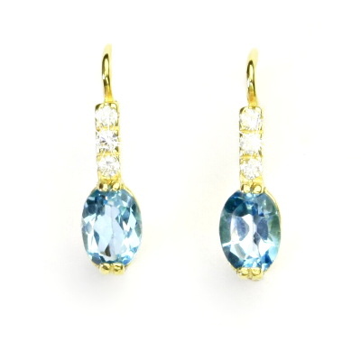 Náušnice ze žlutého zlata jsou zdobeny malými čirými zirkony o průměru 1,75 mm a přírodním topazem swiss o rozměru 7x5 mm. Materiál je žluté zlato 585/1000. Celková výška náušnice je 19 mm. Orientační váha náušnic je 2,35 g.