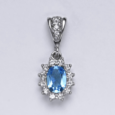Zlatý přívěšek s přírodním topazem swiss a malými čirými zirkony. Velikost topazu je 7x5 mm. Materiál je bílé zlato 585/1000. Celková výška přívěšku je 22 mm. Orientační váha přívěsku je 1,85 g.
