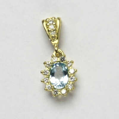 Přívěsek je vyroben ze žlutého zlata. Je zdoben přírodním topazem sky o rozměru 7x5 mm a malými čirými zirkony. Celková výška přívěsku je 22 mm. Materiál je zlato 585/1000. Orientační váha přívěsku je 1,85 g