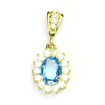 Přívěsek ze žlutého zlata je zdoben čirými zirkony a přírodním topazem swiss o rozměru 8x6 mm. Materiál je zlato 585/1000. Rozměr přívěsku je 24 mm včetně očka na výšku a 11 mm na šířku. Orientační váha přívěsku 2,10 g.