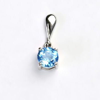 Přívěsek z bílého zlata s přírodním topazem swiss o průměru 6 mm. Materiál je zlato 585/1000. Orientační váha přívěsku je 1,17 g. Rozměr přívěsku je 17 mm včetně úchytu na výšku a 6 mm na šířku.