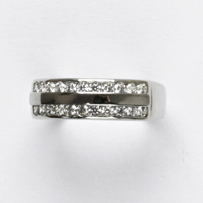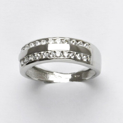 Prsten je vyroben z bílého zlata a je zdoben čirými zirkony. Materiál je zlato 585/1000. Psten máme skladem ve velikosti 53. Orientační váha prstenu je 2,58 g. Tloušťka prstenu je 6 mm.