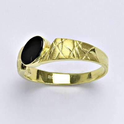 Zlatý prsten s černým onyxem.Zboží zařazené do akce, vždy máme jen jeden kus skladem. Materiál je Zlato 585/1000 (14 karátů). Váha prstenu je 2,80 g. Velikost prstenu je 57.