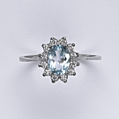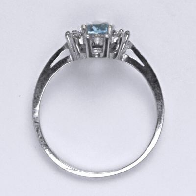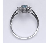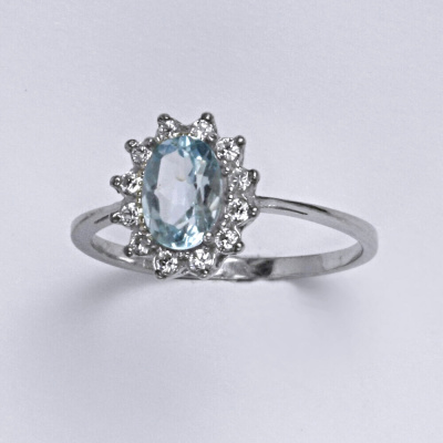 Zlatý prsten s přírodním topazem a malými čirými zirkony. Velikost topazu je 7x5 mm. Materiál je bílé zlato 585/1000. Orientační váha prstenu ve velikosti 54 je 2,37 g.