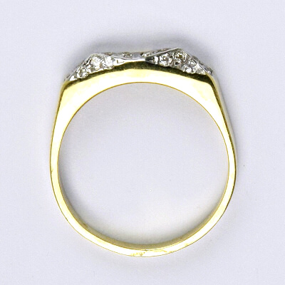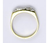 Zlatý prsten je vyrobený v kombinaci žluté a bílé zlato, zdobený syntetickým zirkonem. Velikost prstenu je 56. Materiál je zlato 14 karátů 585/1000.