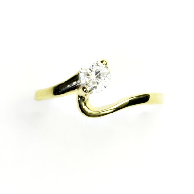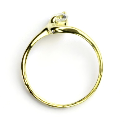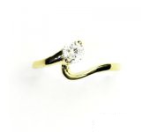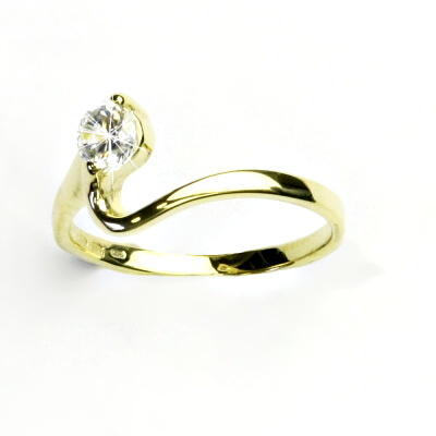 Prstýnek ze žlutého zlata je zdoben čirým zirkonem o průměru 4,75 mm. Materiál je zlato 585/1000. Orientační váha prstenu ve velikosti 54 je 1,98 g. Je vhodný i jako zásnubní prsten.