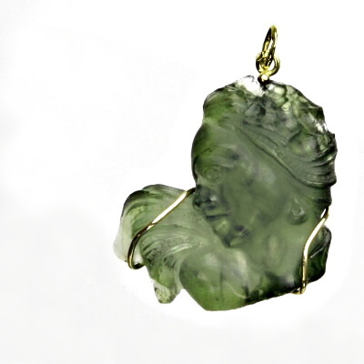 Zlatý přívěsek s přírodním vltavínem - glyptika ženy vybroušená do surového českého vltavínu. Materiál je zlato 585/1000. Rozměr přívěsku je 36 mm včetně očka na výšku a 25 mm na šířku. Orientační váha přívěsku je 6,24 g.