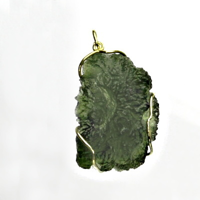 Zlatý přívěsek s přírodním vltavínem. Materiál je zlato 585/1000. Rozměr přívěsku je 37 mm včetně očka na výšku a 21 mm na šířku. Orientační váha přívěsku je 7,53 g.