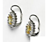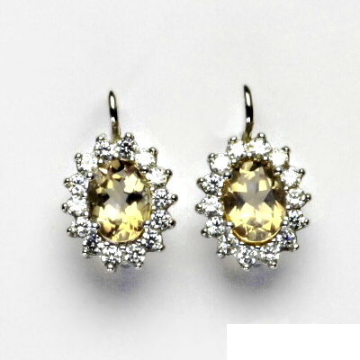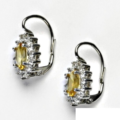 Náušnice z bílého zlata jsou zdobeny čirými zirkony a přírodním citrínem o rozměru 8x6 mm. Materiál náušnic je zlato 585/1000. Celková rozměr náušnice na výšku je 20 mm a 11,5 mm na šířku. Orientační váha náušnic je 3,9 g.