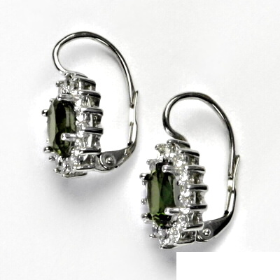 Náušnice z bílého zlata jsou zdobeny čirými zirkony a přírodním vltavínem o rozměru 8x6 mm. Materiál náušnic je zlato 585/1000. Celková rozměr náušnice na výšku je 20 mm a 11,5 mm na šířku. Orientační váha náušnic je 3,9 g.