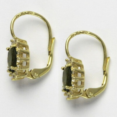 Náušnice jsou vyrobeny ze žlutého zlata. Jsou zdobeny přírodním vltavínem o rozměru 7x5 mm a malými čirými zirkony. Celková výška náušnice je 18 mm. Materiál je zlato 585/1000. Orientační váha náušnice 3,40 g.