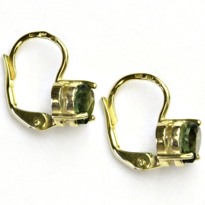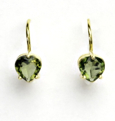 Náušnice ze žlutého zlata s přírodním vltavínem, ve tvaru srdíčka, o rozměru 6x6 mm. Materiál je zlato 585/1000. Náušnice mají zapínání na klapku. Orientační váha je 2,26 g. Celková výška náušnice je 14 mm.