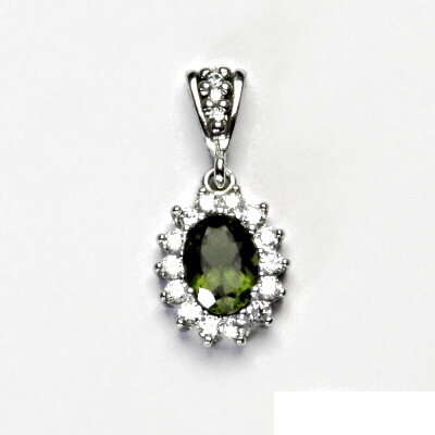 Přívěsek z bílého zlata je zdoben čirými zirkony a přírodním vltavínem o rozměru 8x6 mm. Materiál je zlato 585/1000. Rozměr přívěsku je 24 mm včetně očka na výšku a 11 mm na šířku. Orientační váha přívěsku 2,10 g.