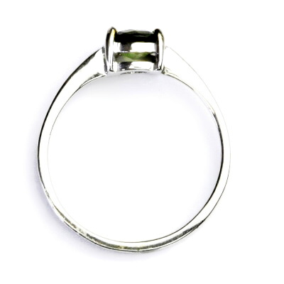Prstýnek z bílého zlata je zdoben přírodním vltavínem o průměru 6 mm. Vltavín má brus šachovnice. Materiál je zlato 585/1000. Orientační váha prstenu ve velikosti 54 je 2,36 g.