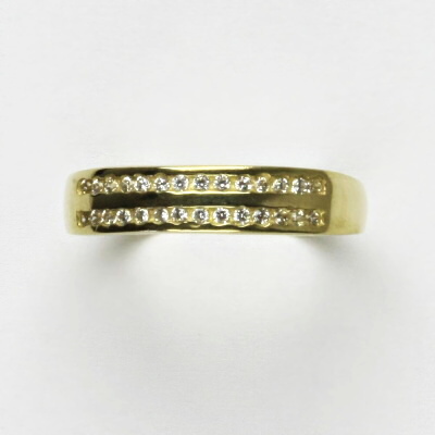 Zlatý prsen je zdoben čirými zirkony o průměru 1 mm. Materiál je zlato 585/1000. Šířka prstenu je 5 mm. Orientační váh prstenu 3,11 g. Skladem máme psten ve velikosti 59.