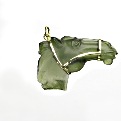 Zlatý přívěsek s přírodním vltavínem - glyptika koně vybroušená do surového českého vltavínu. Materiál je zlato 585/1000. Rozměr přívěsku je 27 mm včetně očka na výšku a 33 mm na šířku. Orientační váha přívěsku je 5,44 g.