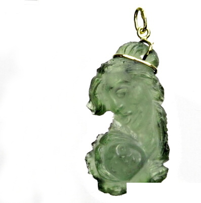 Zlatý přívěsek s přírodním vltavínem - glyptika ženy s dítětem vybroušená do surového českého vltavínu. Materiál je zlato 585/1000. Rozměr přívěsku je 40 mm včetně očka na výšku a 17 mm na šířku. Orientační váha přívěsku je 4,78 g.