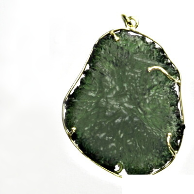 Zlatý přívěsek s přírodním vltavínem. Materiál je zlato 585/1000. Rozměr přívěsku je 38 mm včetně očka na výšku a 25 mm na šířku. Orientační váha přívěsku je 10,81 g.