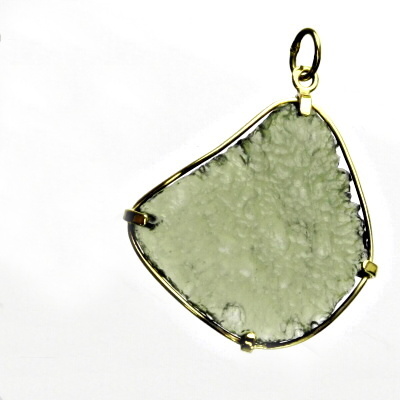 Zlatý přívěsek s přírodním vltavínem. Materiál je zlato 585/1000. Rozměr přívěsku je 36 mm včetně očka na výšku a 28 mm na šířku. Orientační váha přívěsku je 3,30 g.